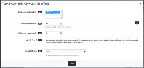 This plugin will allow you to automatically generate keywords meta tag based on topic title, first post or based on them both.